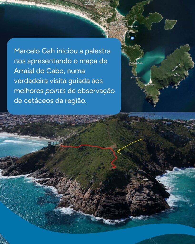 Marcelo Gah iniciou a sessão com uma verdadeira visita guiada, apresentando um detalhado mapa de Arraial do Cabo. O público foi conduzido pelos melhores pontos de observação de cetáceos da região, explorando a localização de praias e as rotas mais frequentes de baleias e golfinhos. Gah também revelou a localização estratégica de seu ponto fixo de observação, a 45 metros acima do nível do mar, de onde realiza suas capturas espetaculares.
